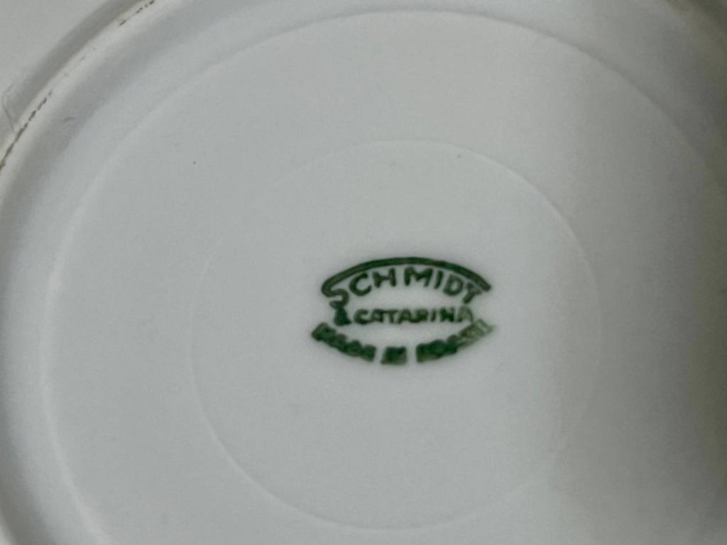 Conjunto de porcelana Schmidt. Sete xícaras para café médio com pires; uma xícara para café médio e um pires-cinzeiro, um cinzeiro em forma de bola de futebol.
