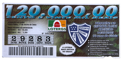 Bilhete oficial de loteria em homenagem aos 90 anos do Cruzeiro, comemorados em 14 de julho de 2003.